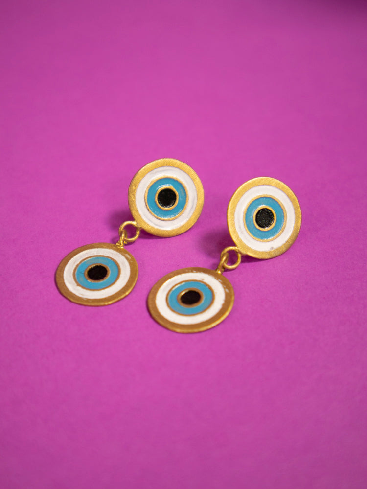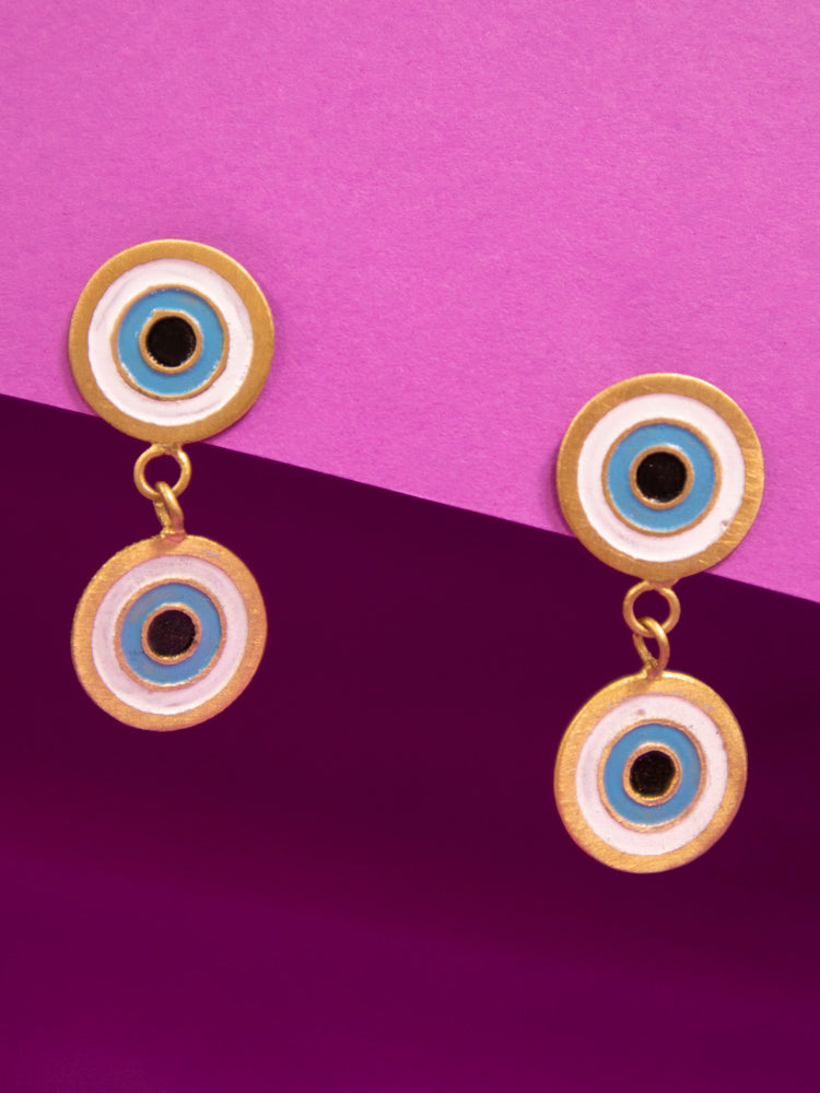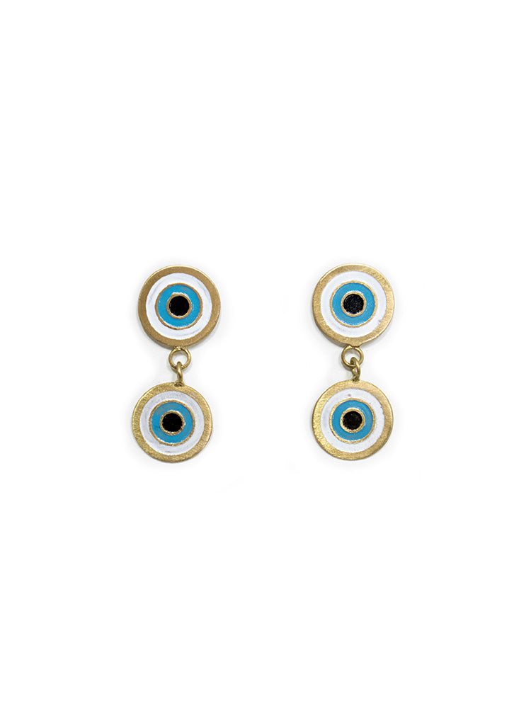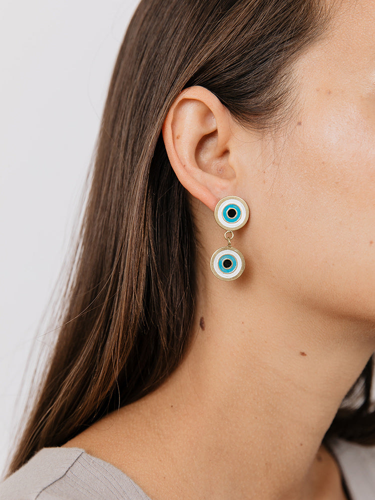 You'll be a vision in these evil eye earrings, made with bold, bright enamel paint on brass. Take your fun, casual look to the next level when wearing these dangle studs.