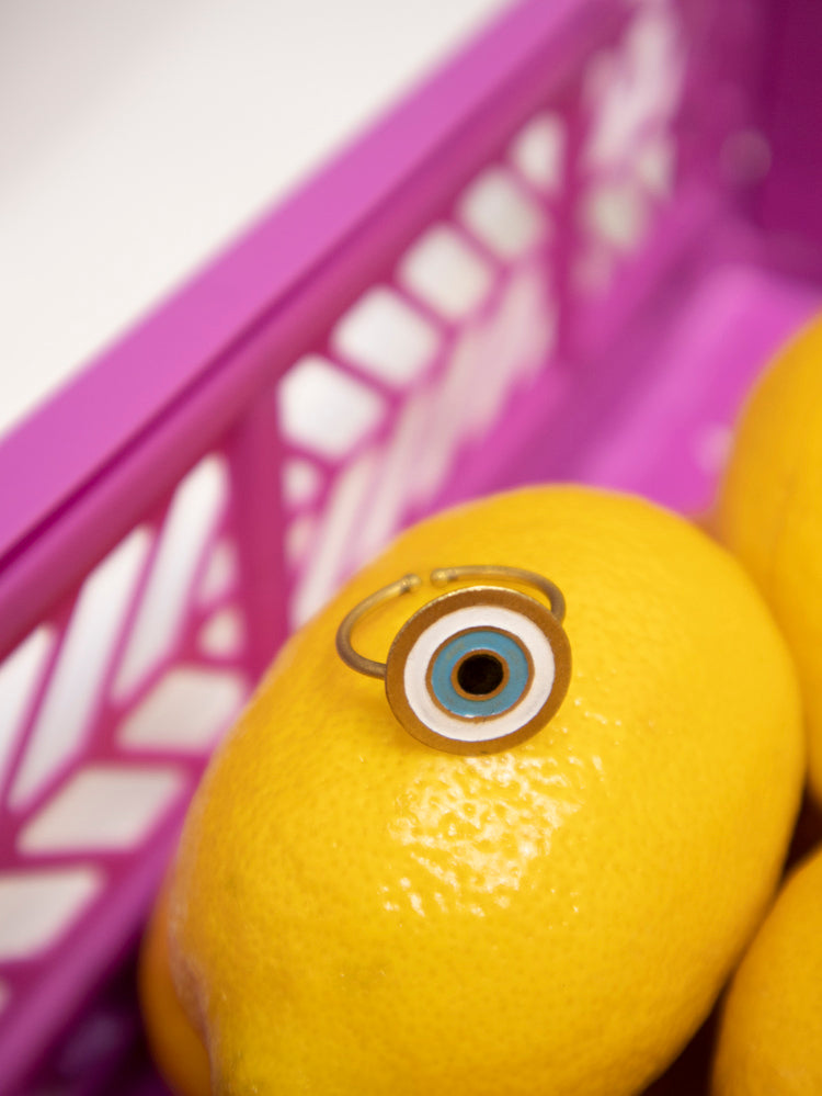 You'll be a vision in this evil eye ring, made from bold, bright enamel painted brass. This adjustable ring is minimal enough to go with everything, but adds maximum fun to any look.