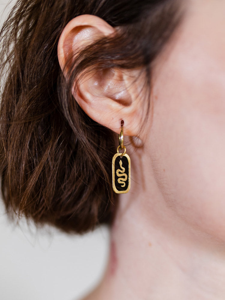 These huggie hoops have a serpentine twist. Add a subtle accent to any look with these goldtone earrings featuring dangling graphic snake charms.