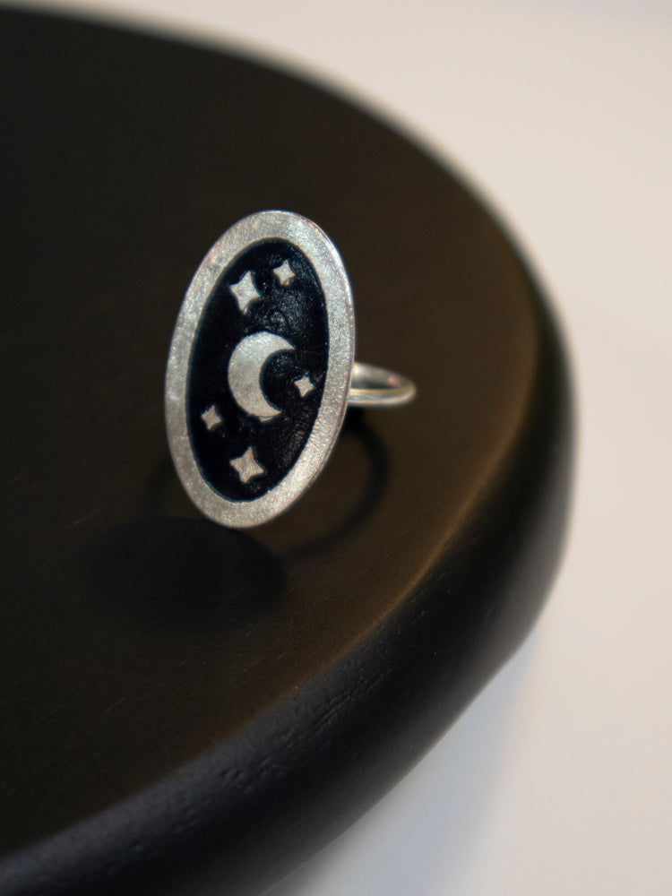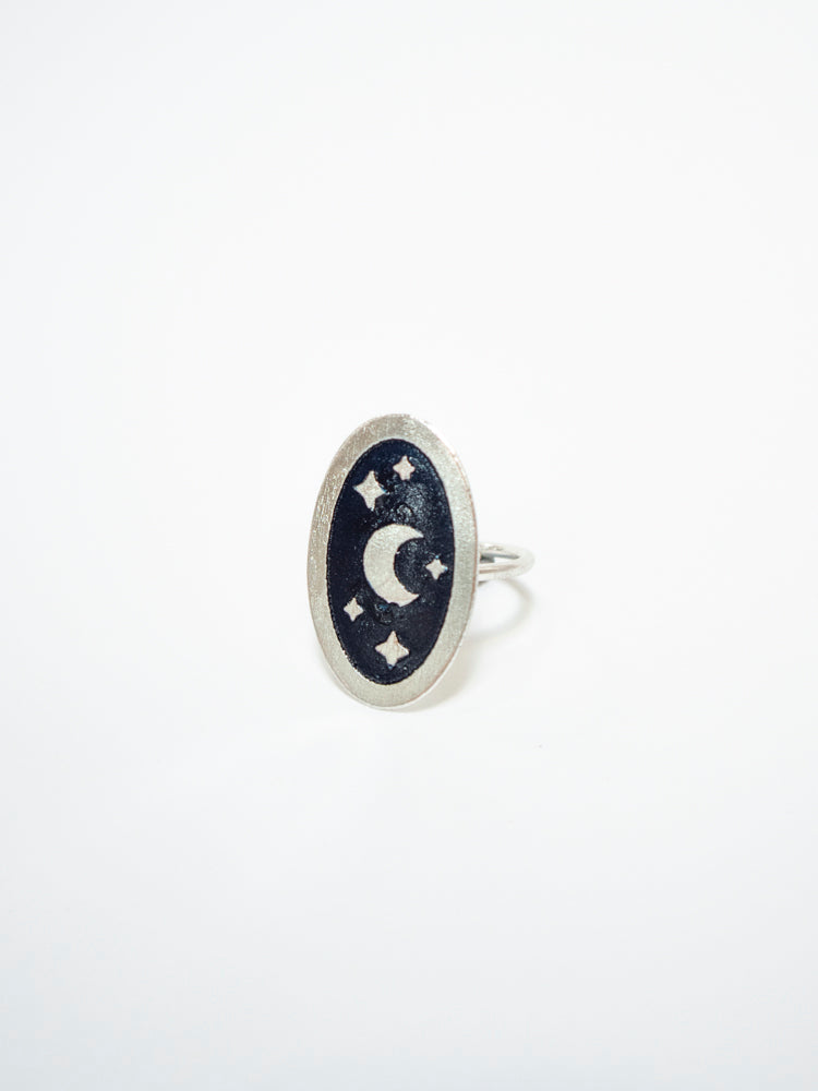 This celestial moon scene ring will have you looking cosmic cool. Made from black enamel painted on silver tone brass, this adjustable ring makes a statement for fall.