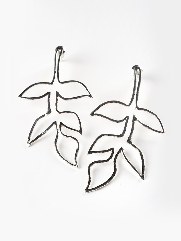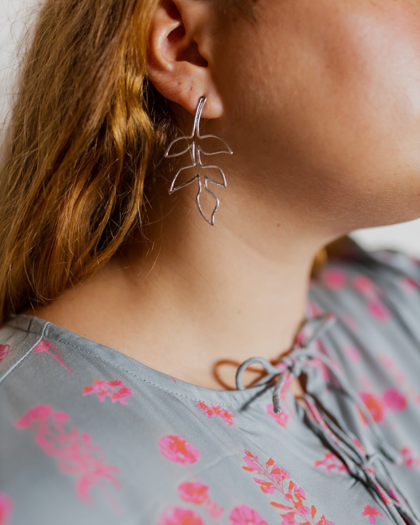 These leaf earrings are shaped from silver tone brass and dangle from the ear with a stud back. Simple in style, but bold in size, these earrings can easily be dressed up or down.