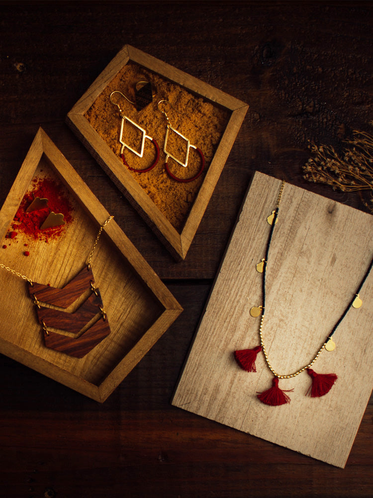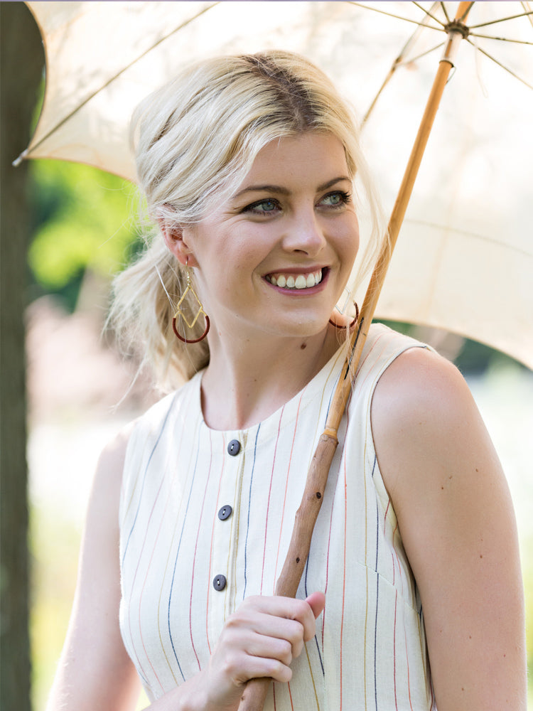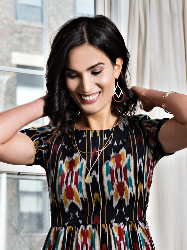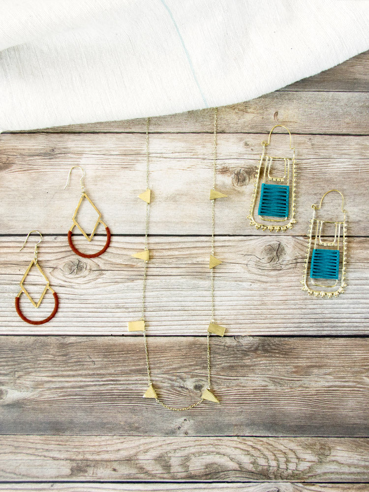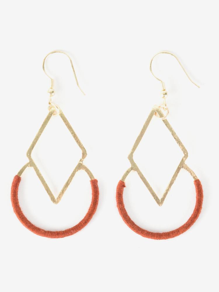 Our Graphic Threads earrings feature a striking design created using brass with colorful hand-wrapped thread. Accentuate these earrings with a solid color top.