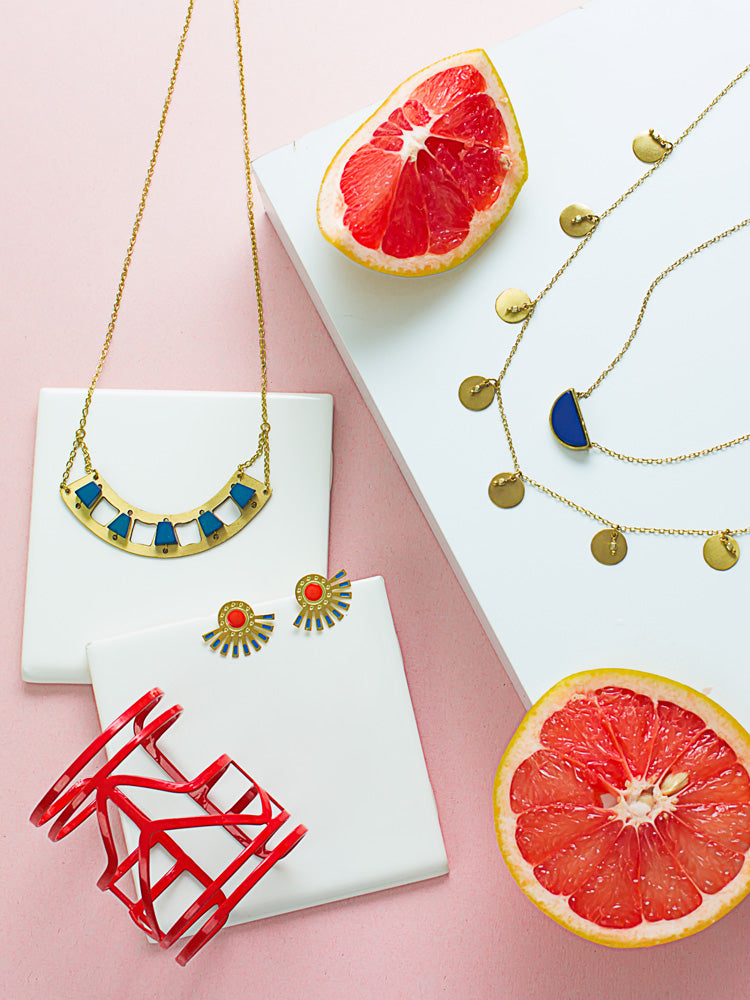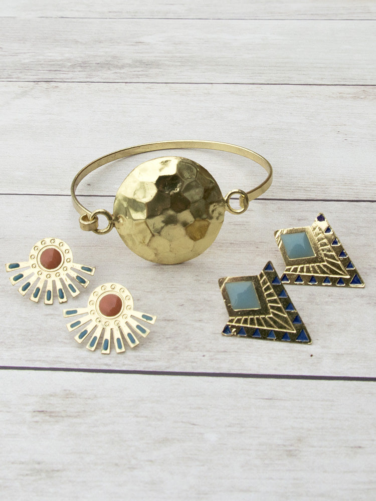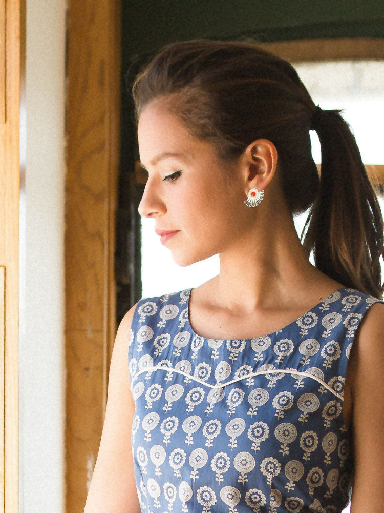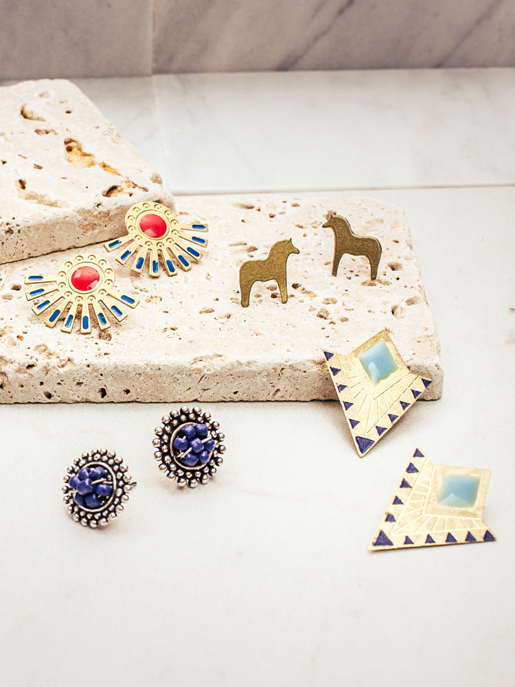 Our Helios stud earrings are gorgeous, hand crafted, and hand painted. Their bold colors are perfect for Spring and Summer outfits, especially ones with red accents. Pair them with red and blue bangles for added flair.
