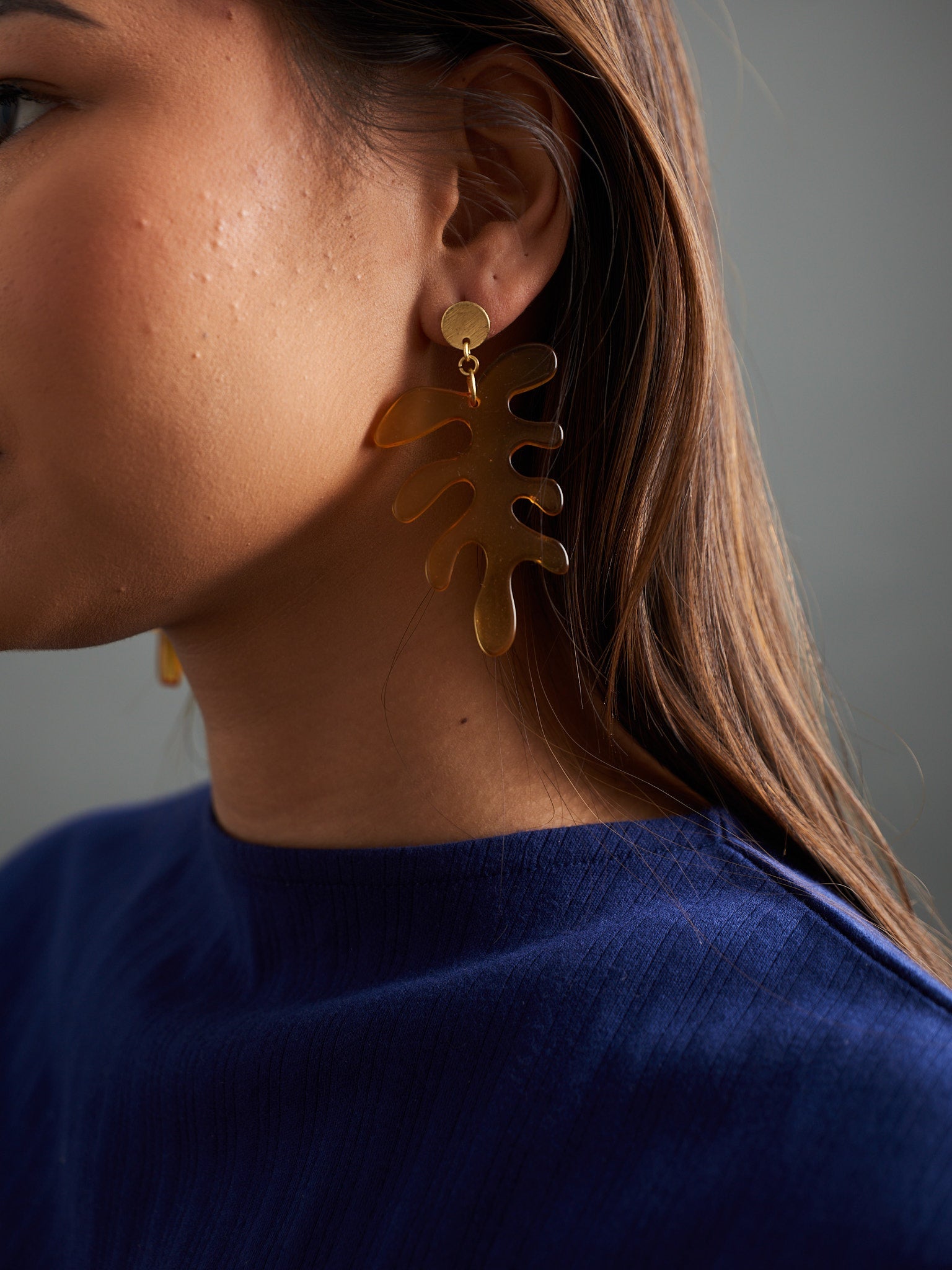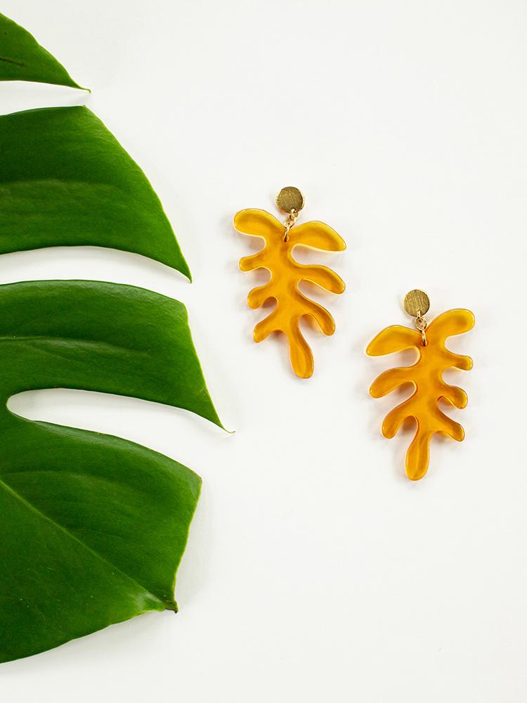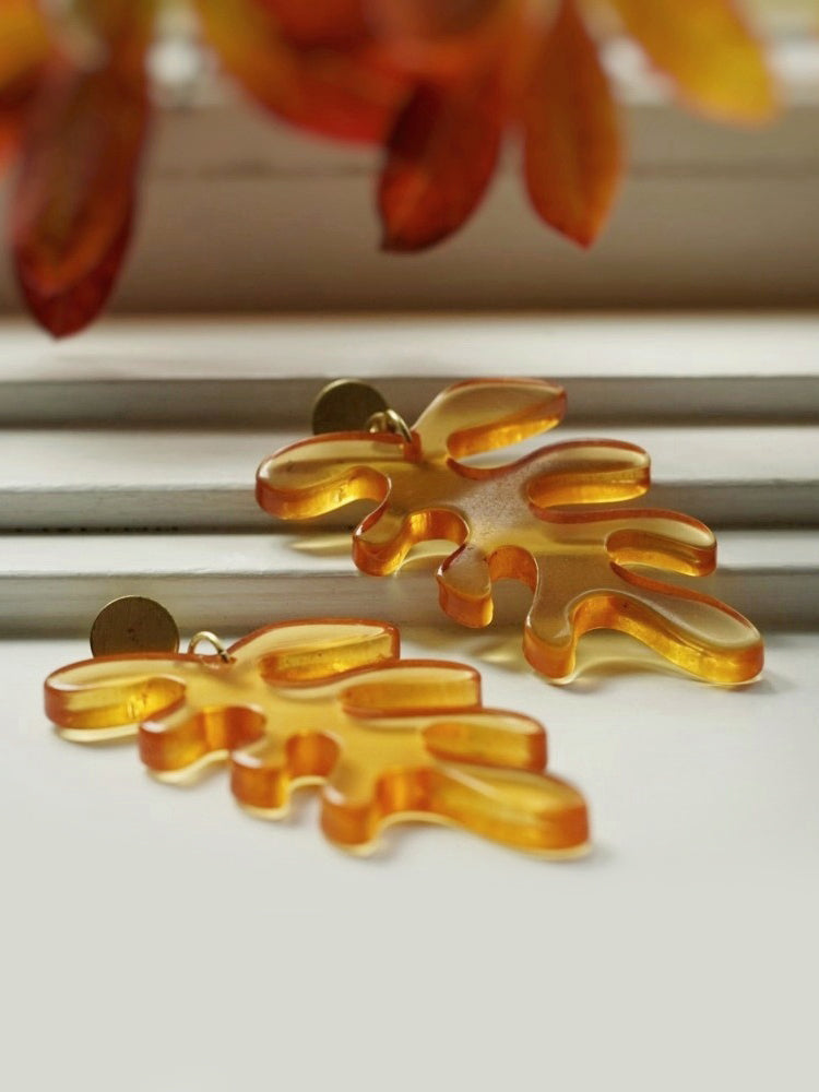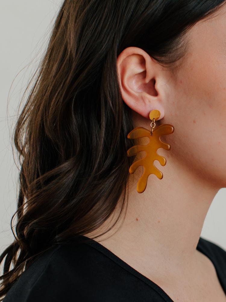 Add some color to your day in amber statement earrings. The leaf shape brings a playful spirit to an everyday outfit.