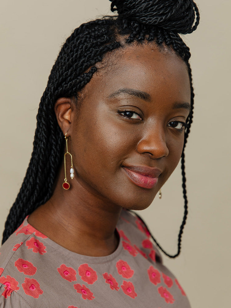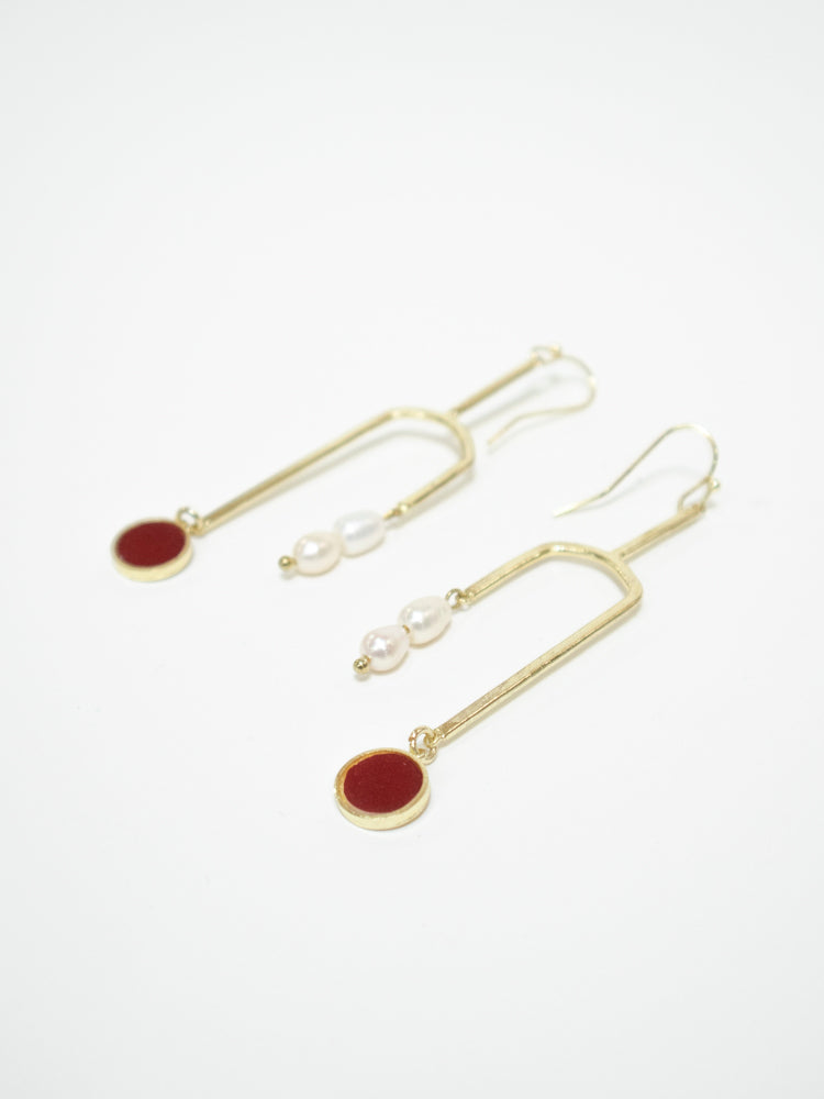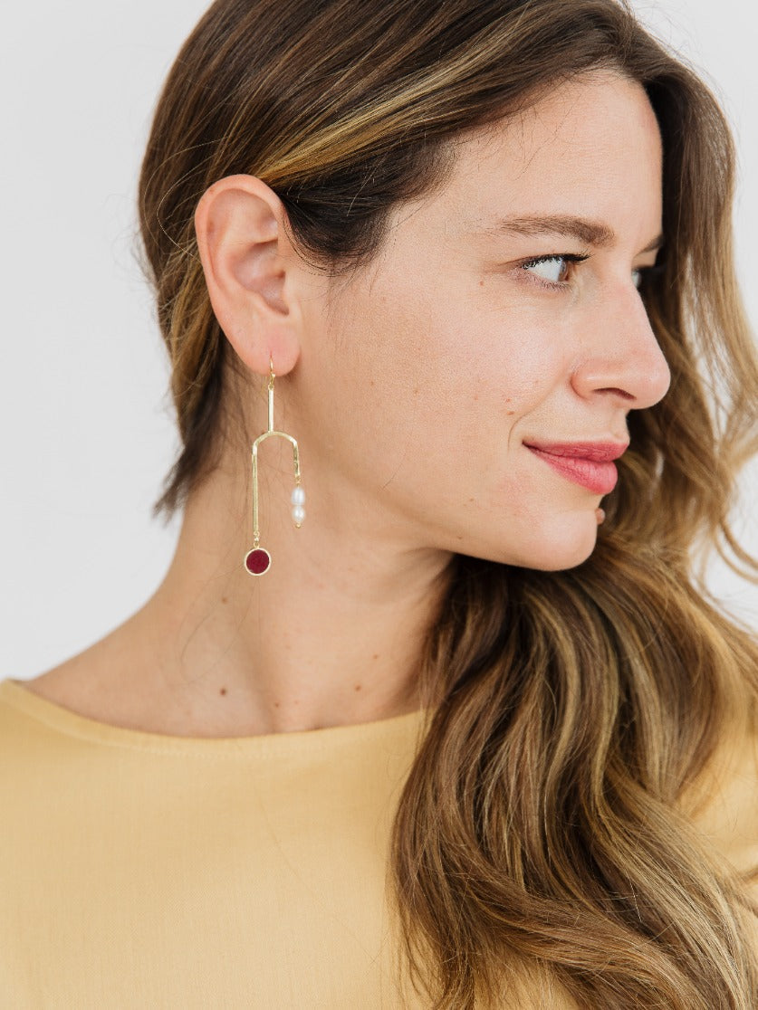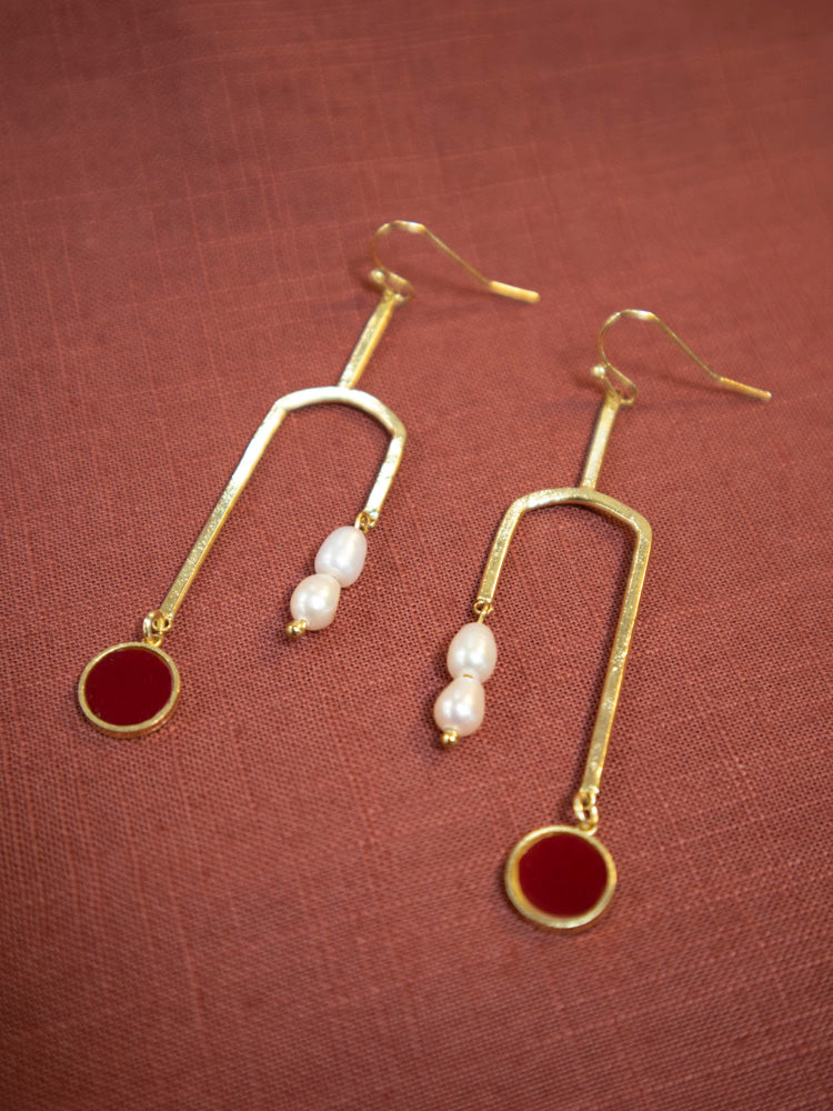 These dangle earrings are contemporary art in motion, featuring freshwater pearl beads balancing out a merlot enamel disc. Pair these gold tone earrings with your outfit to elevate any look.