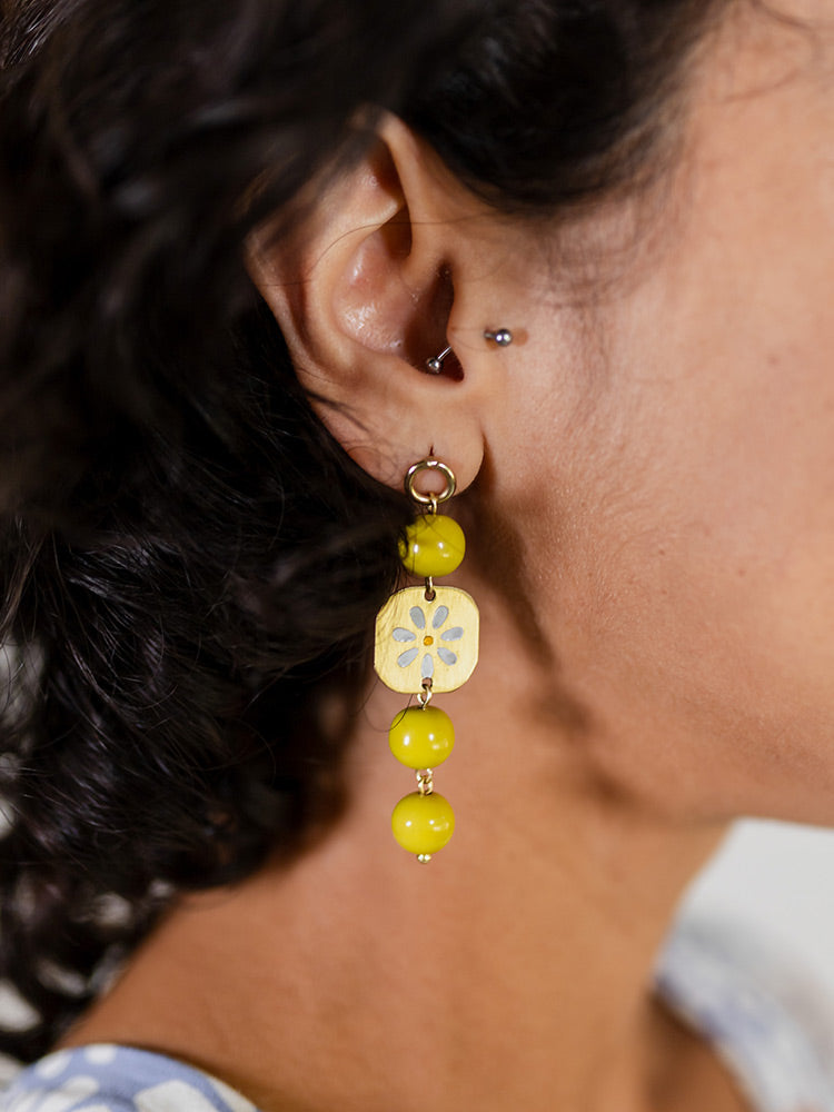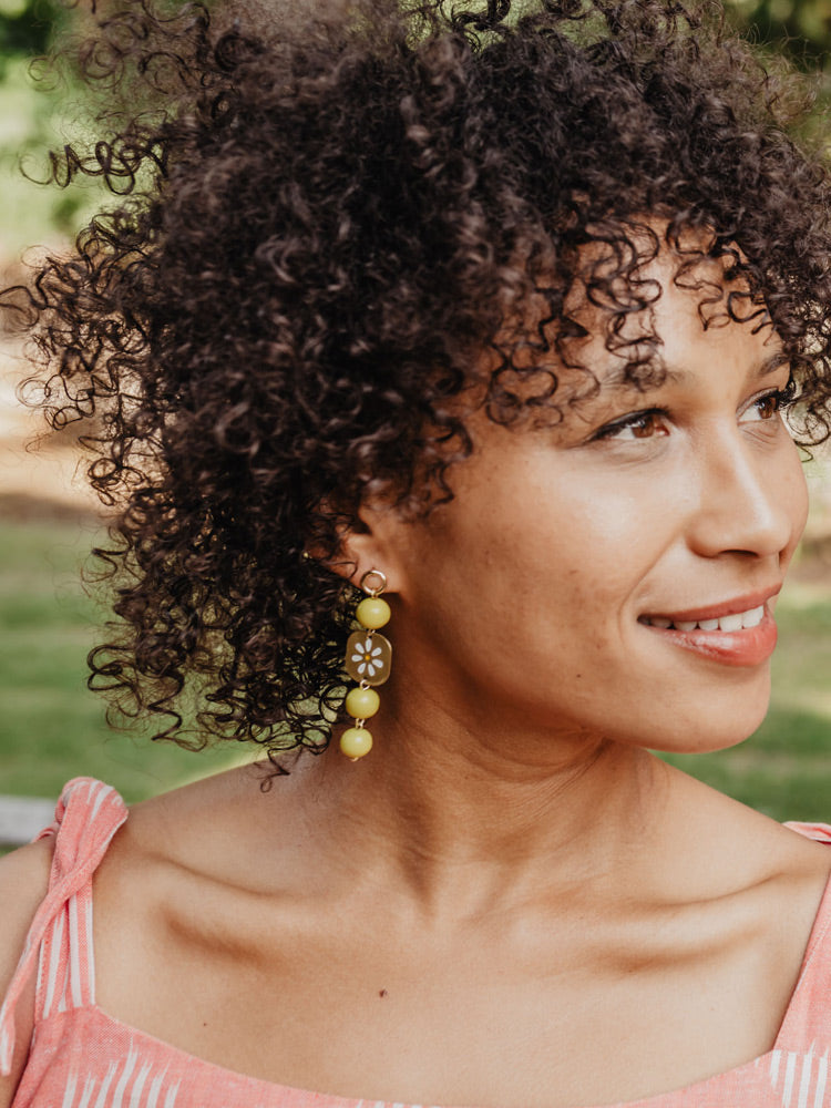 These dangle earrings feature fun chartreuse beads accented with a painted daisy. They're great for dressing up a tee and jeans, or expanding the pastel palette of a spring look.