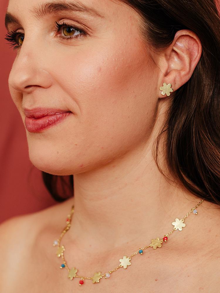 Find your inner '60s child in this goldtone brass flower necklace. The multi-colored glass beads are perfect for a minimalist who wants a little color.