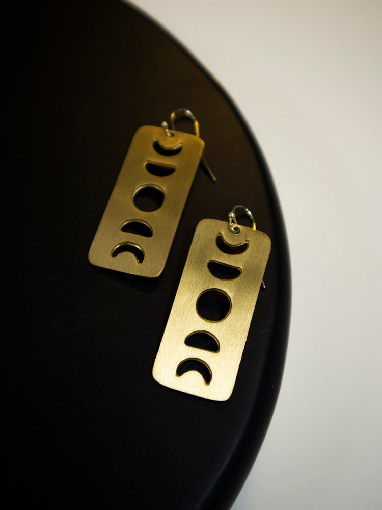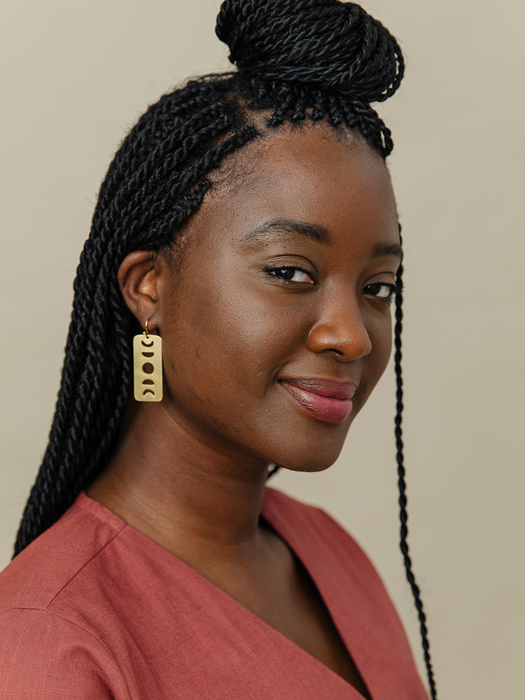 These dangle earrings feature simple moon phase shapes cut from a polished brass rectangle. Make a statement with shine, or rope them into your everyday look. These simple but stunning earrings will be your new favorites.