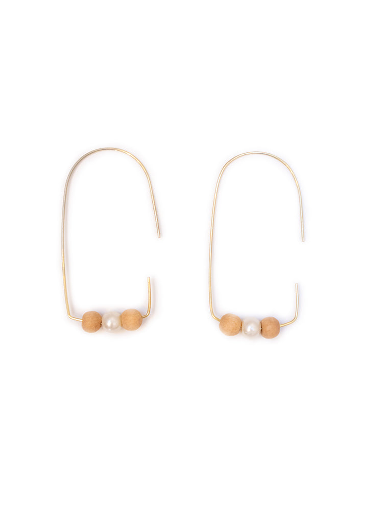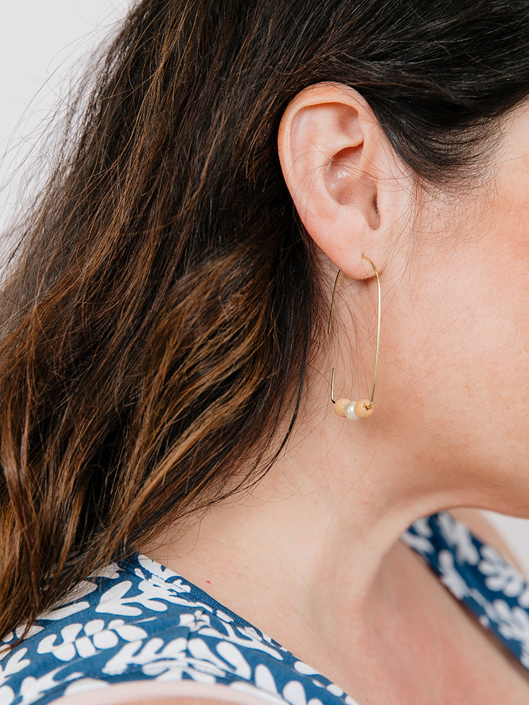 These simple hook earrings have a trio of wood and pearl beads threaded on a simple gold-tone ear wire. Wear these sophisticated earrings when you want to elevate your look with a lovely, minimal bit of shine and shape.