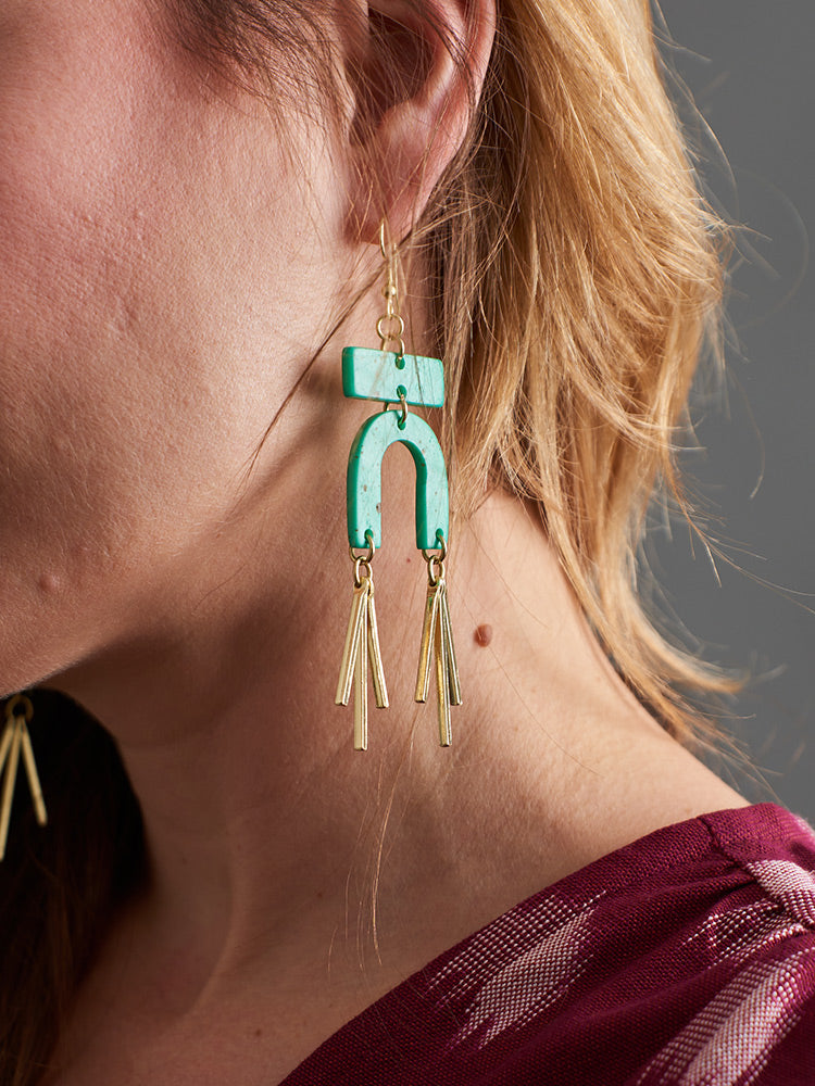 Upcycled bone earrings bring a playful spirit to your look with a versatile turquoise color. This subtle statement piece is meant to celebrate your inner creativity.